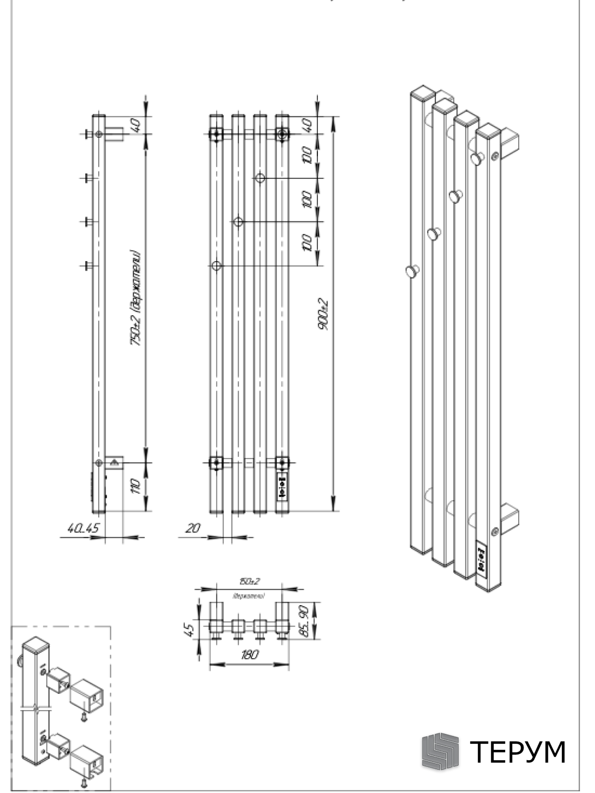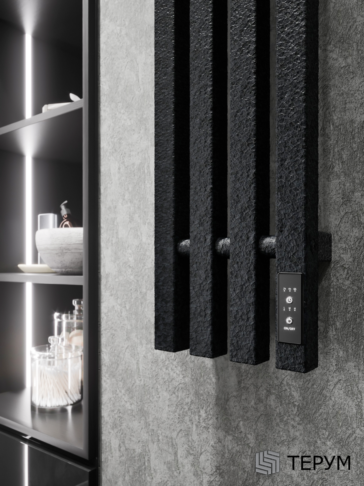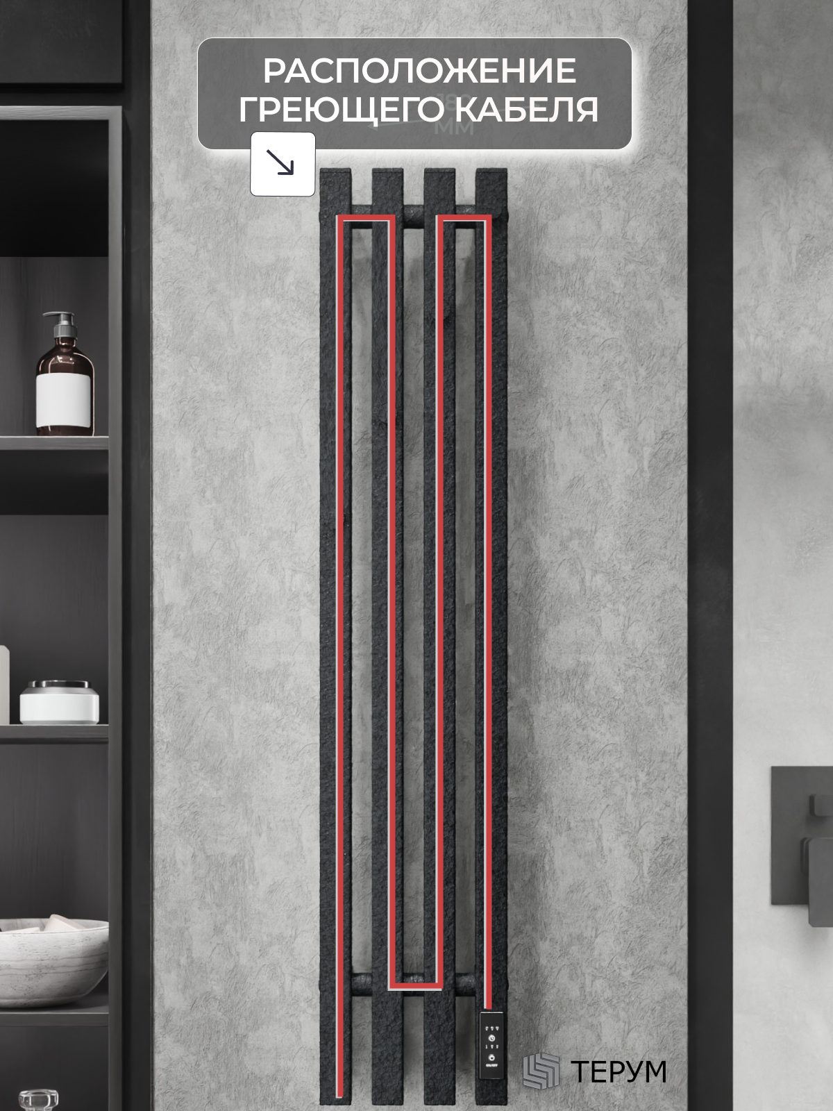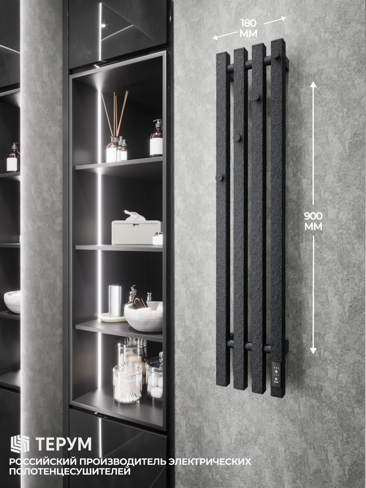 Конструкция: Вертикальная модель из квадратного профиля, 4 крючка на изделии. Дизайнерское покрытие под крокодиловую кожу. Встроенный терморегулятор с таймером. Нагрев за 15 минут.