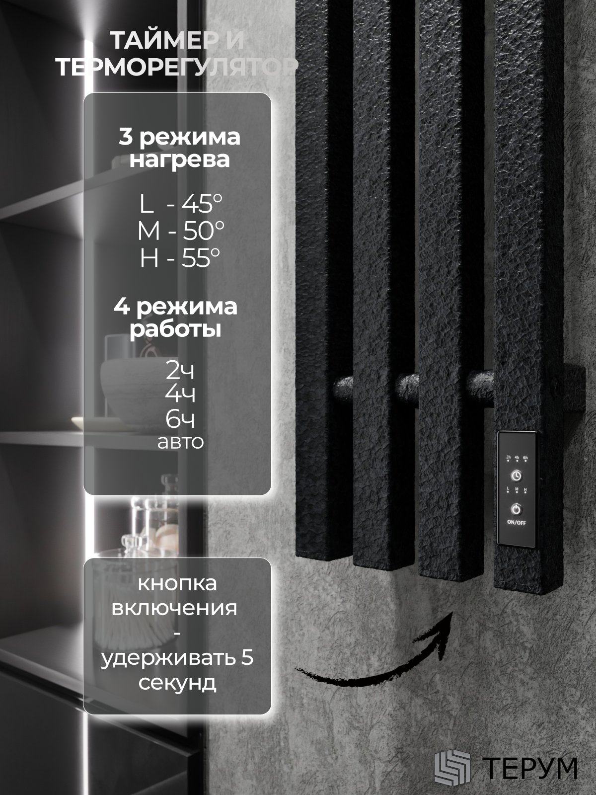 Управление: Оснащен терморегулятором на 45, 50, 55°C и таймером работы – 2, 4, 6 часов, авто.