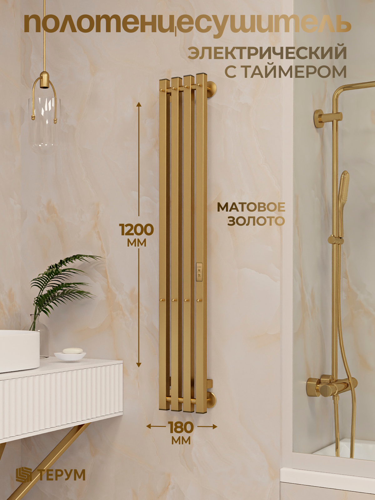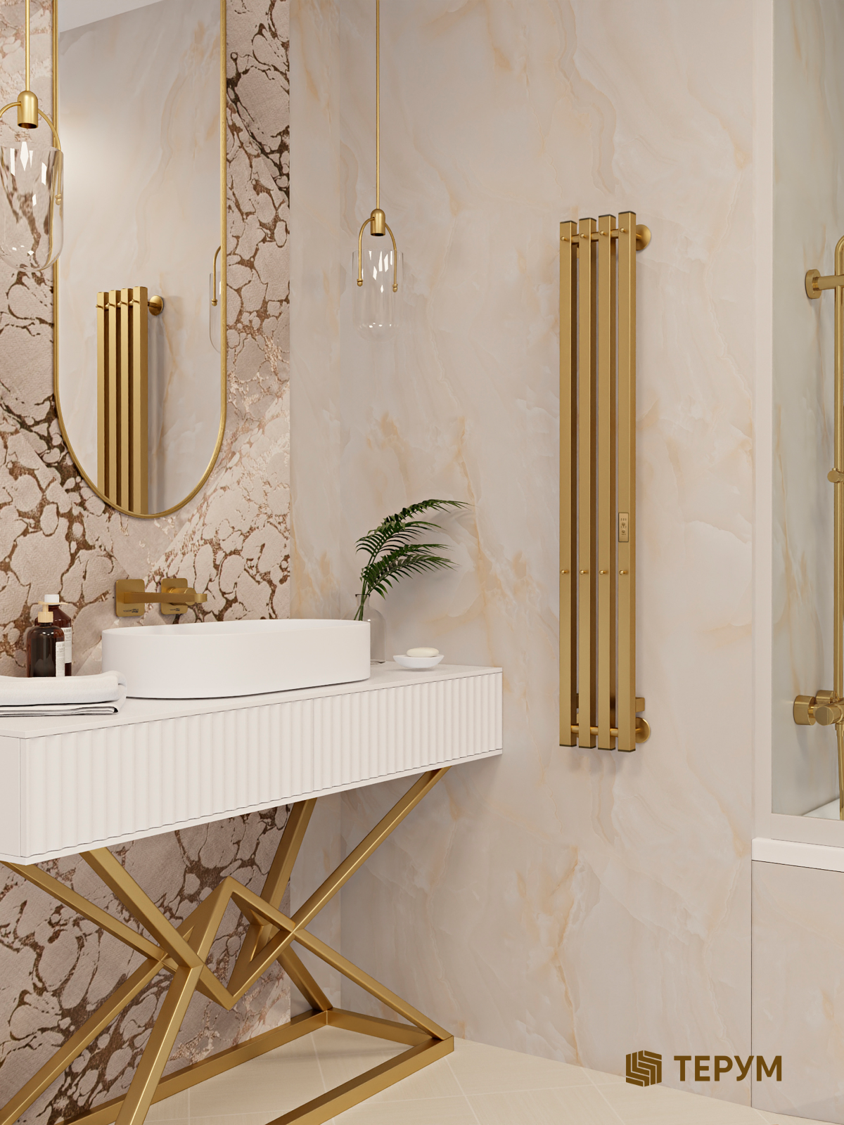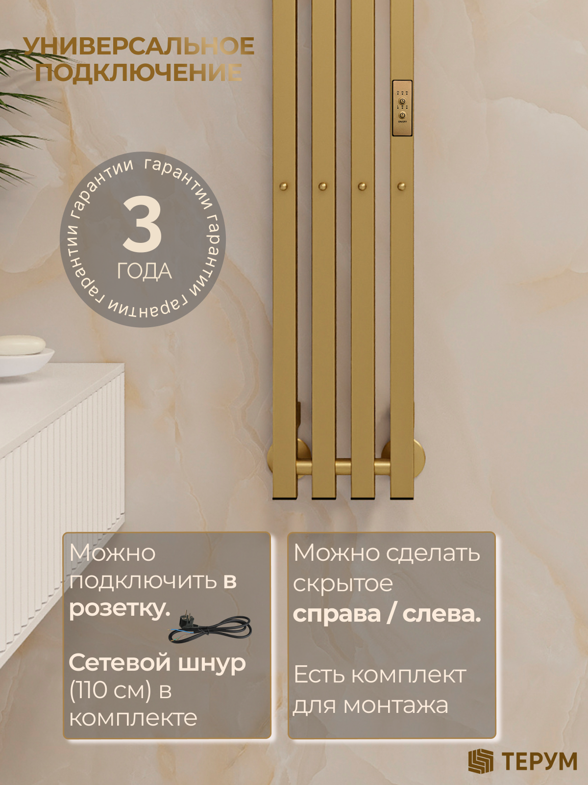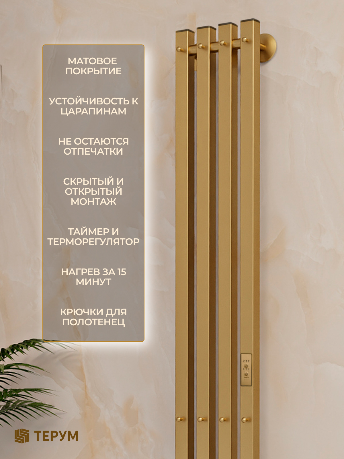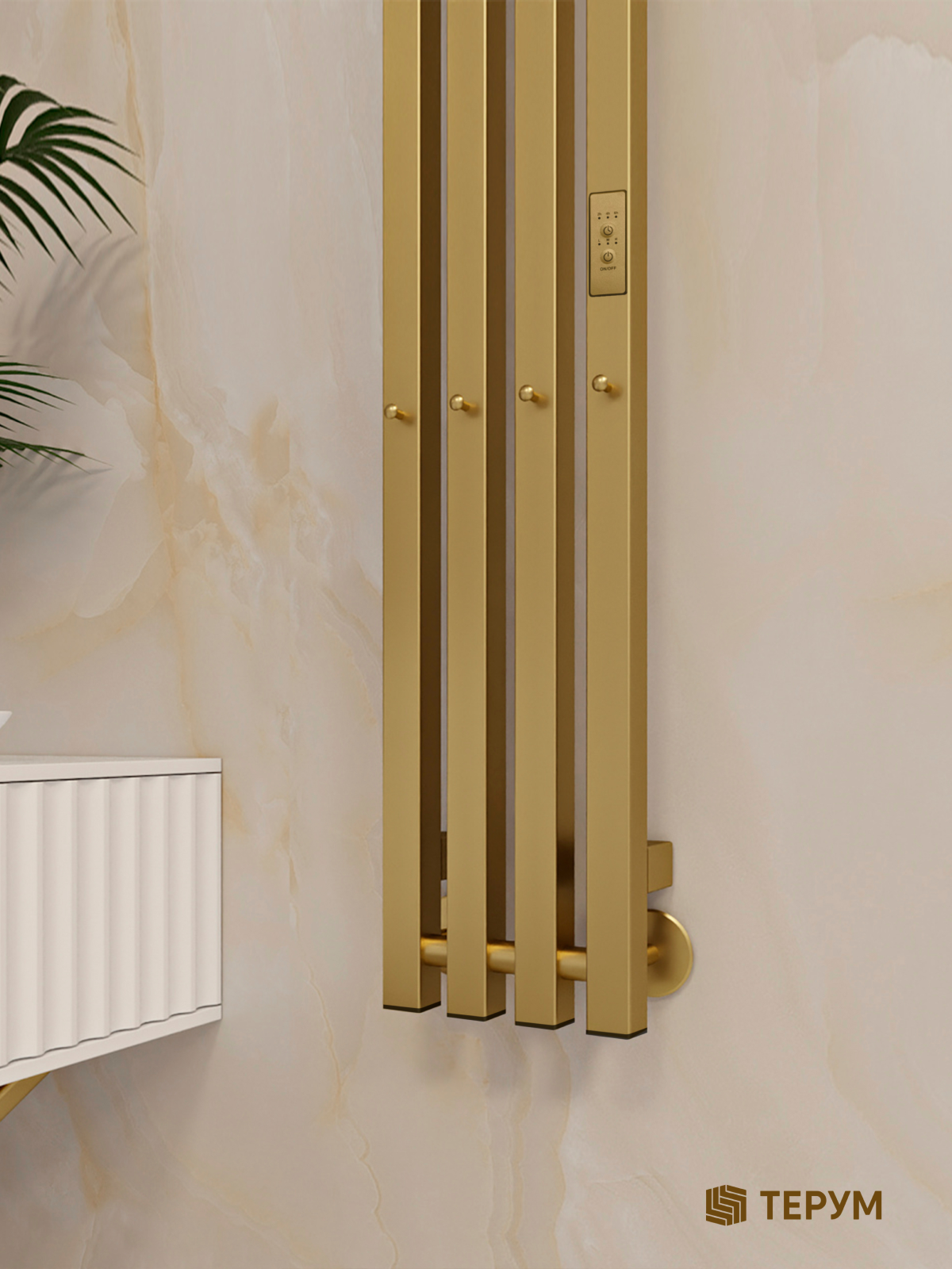 Электрический полотенцесушитель Marco 4 PRO в цвете матовое золото. Компактная вертикальная модель с матовым покрытием золотого цвета. Распределенные по изделию крючки позволяют комфортно разместить текстиль и обеспечить всегда теплые полотенца под рукой. Покрытие устойчиво к царапинам, на нем не остаются отпечатки во время эксплуатации. Узкий полотенцесушитель не занимает много места и подойдет даже для небольшой ванной комнаты. Помогает создать комфортный микроклимат в ванной и предотвратить появление плесени.