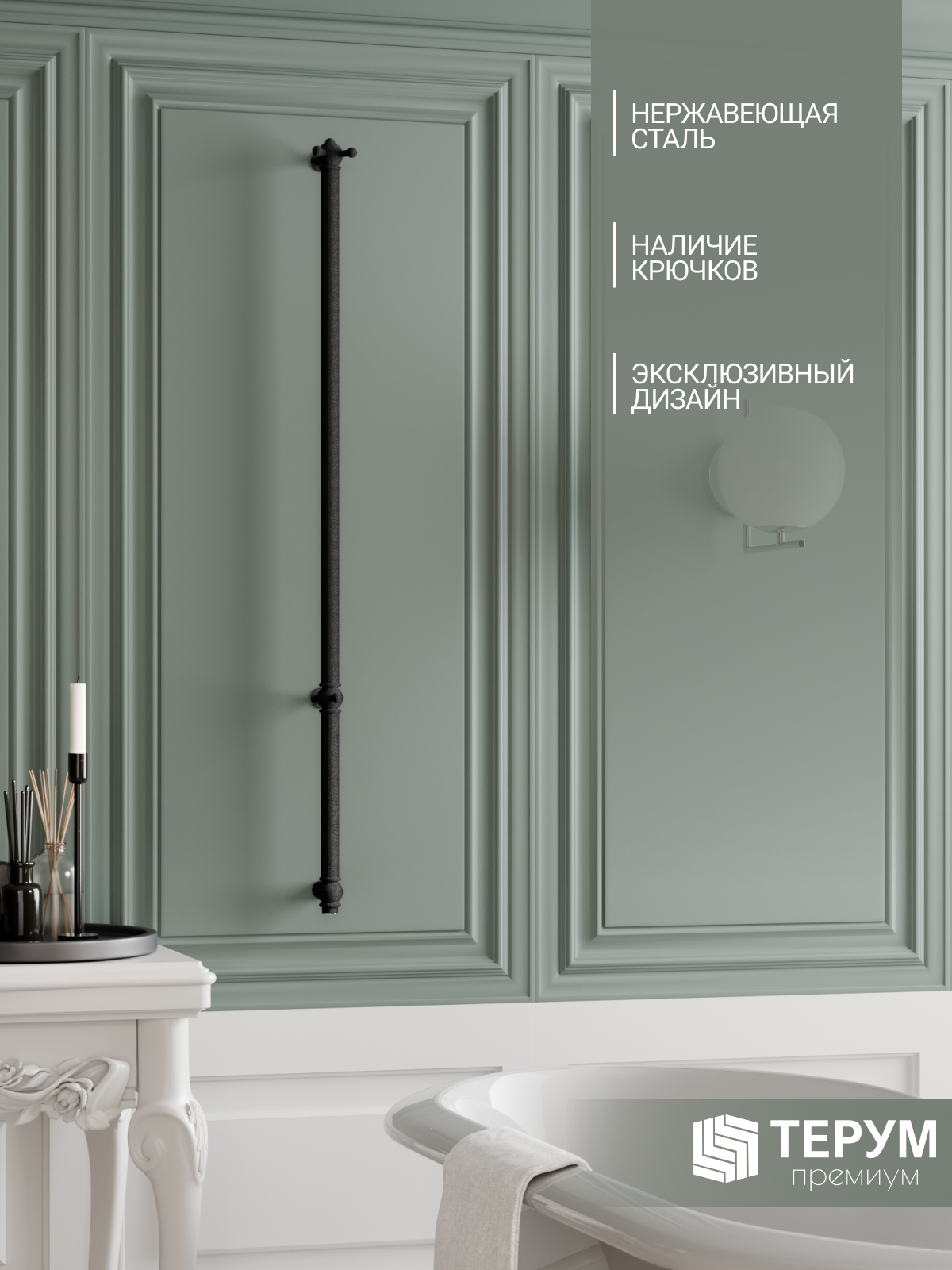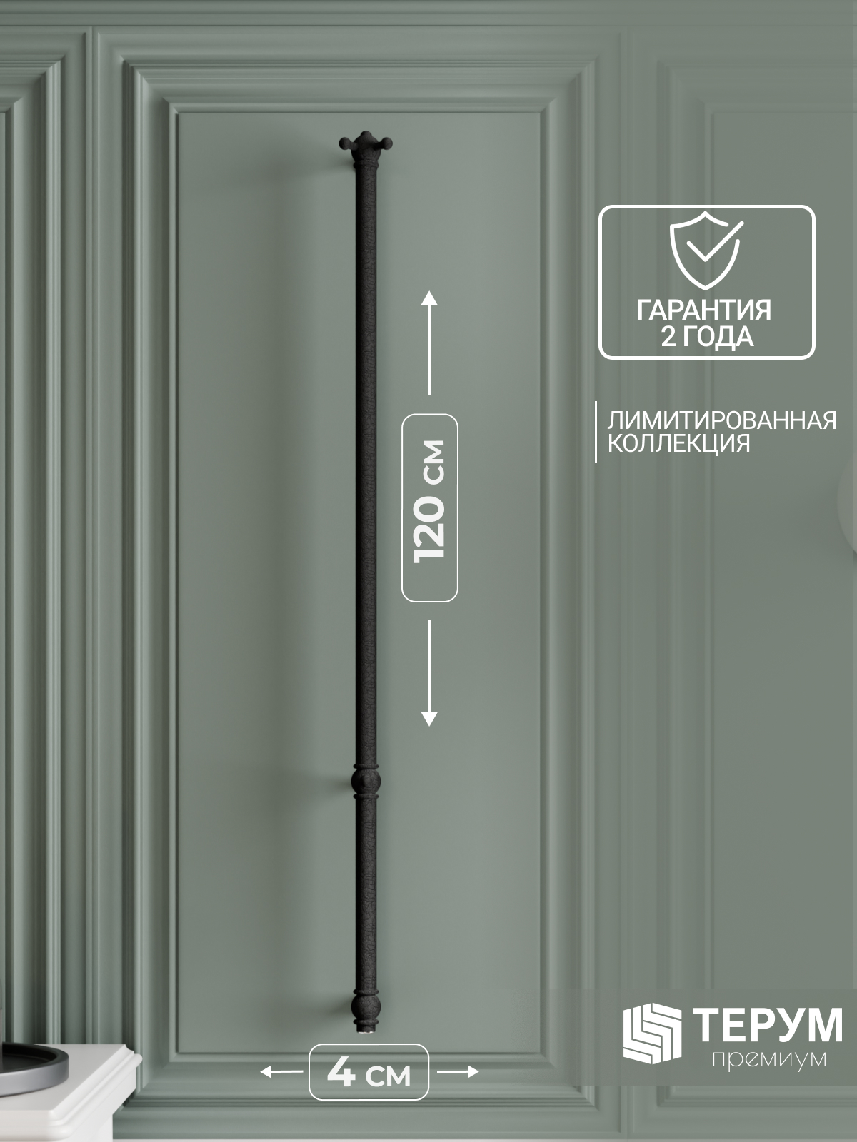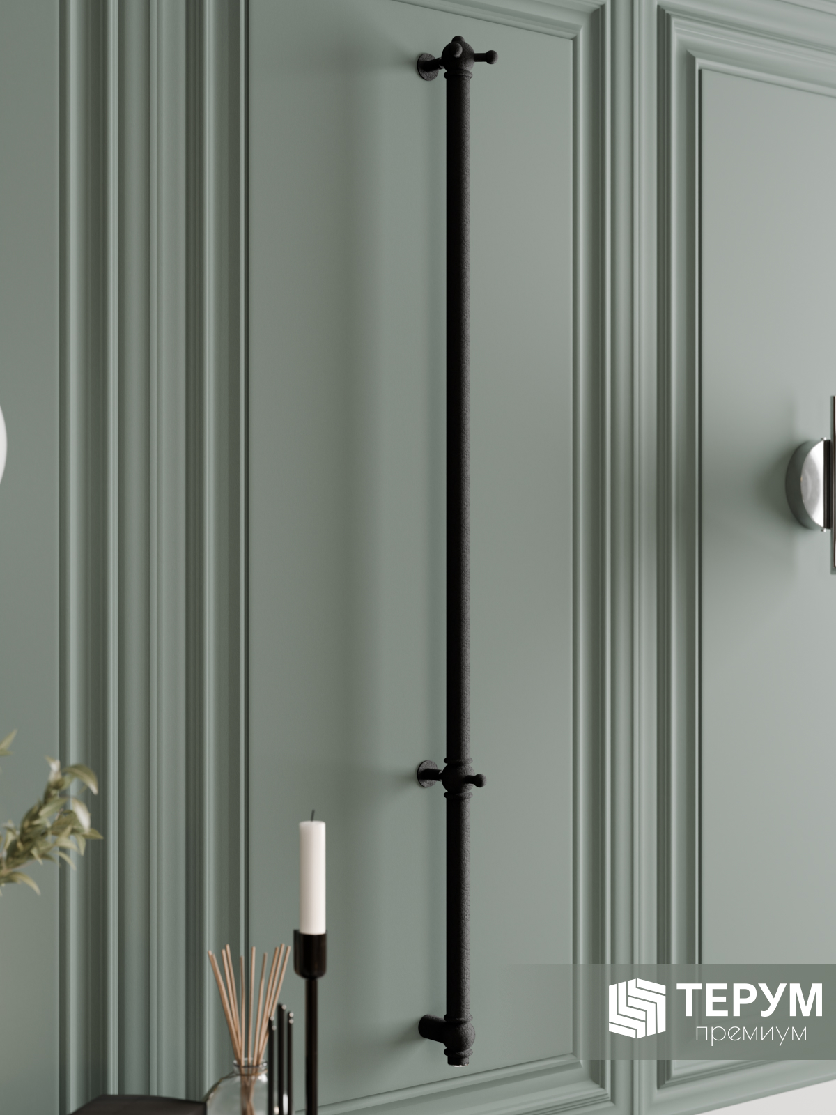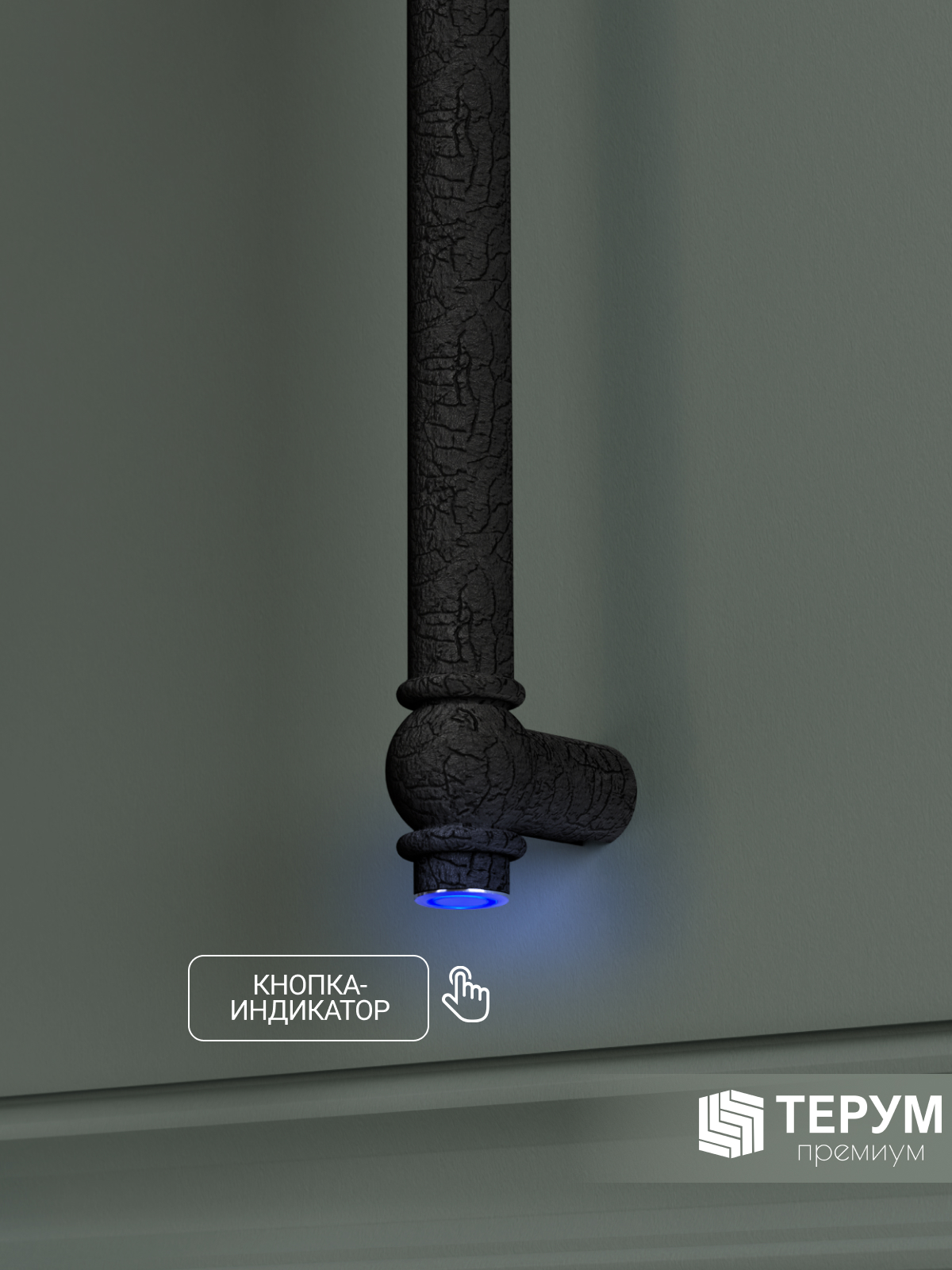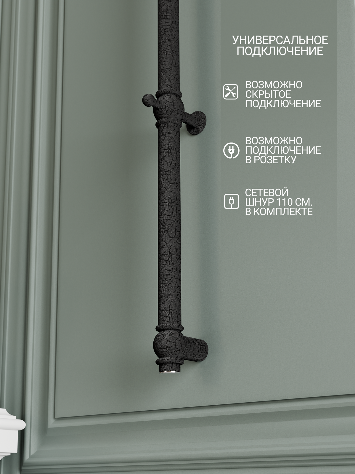 Конструкция: Вертикальная модель из круглого профиля с фактурой и крючками на изделии. Матовое черное покрытие. Кнопка включения/выключения с подсветкой.