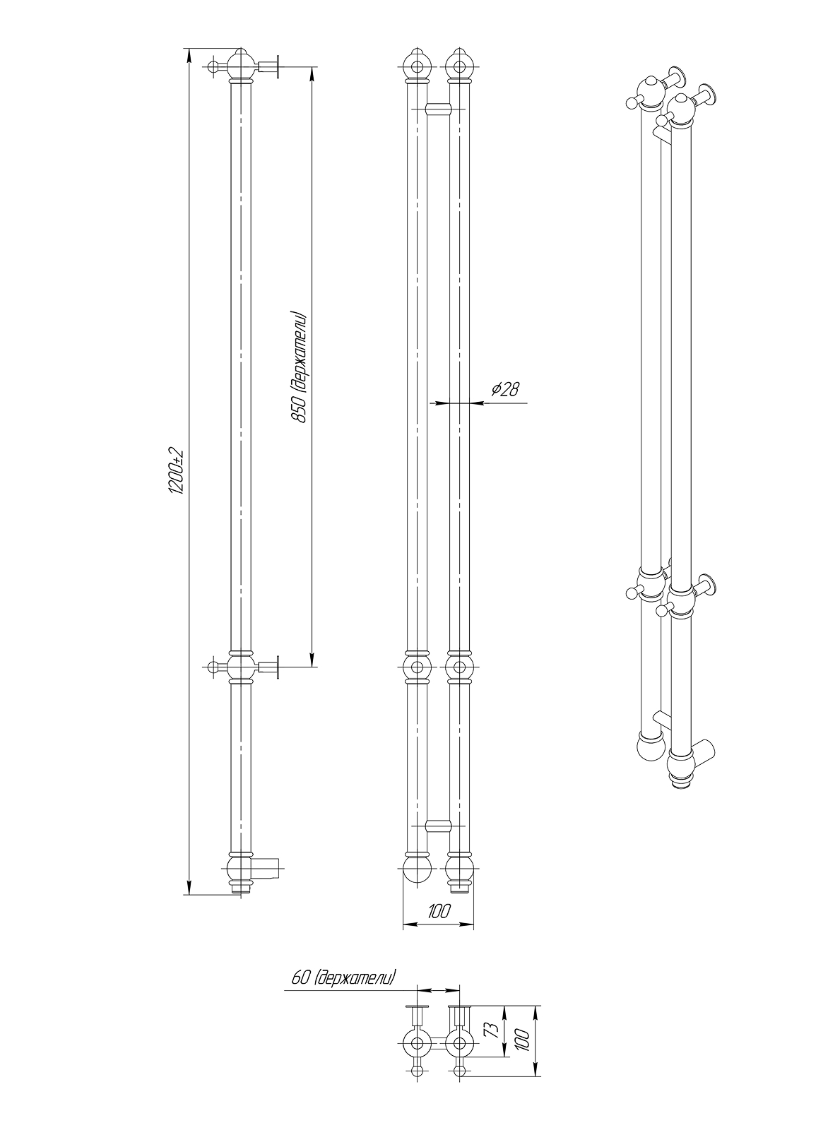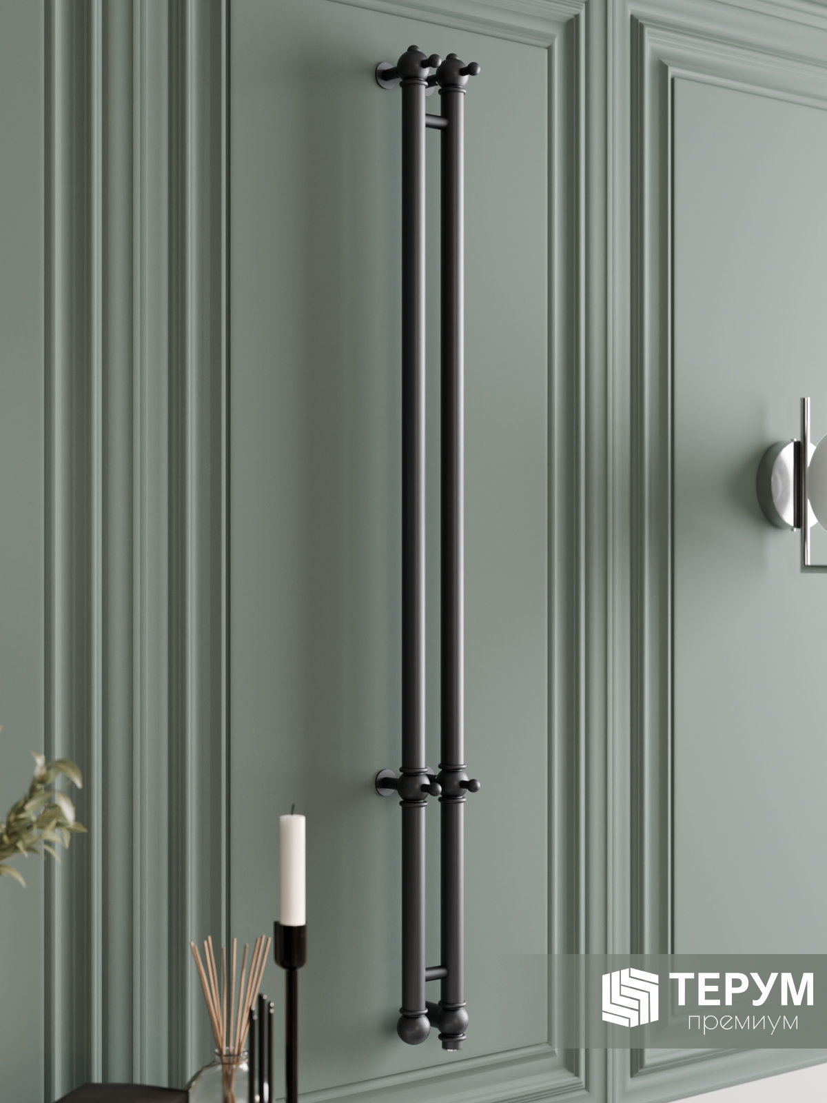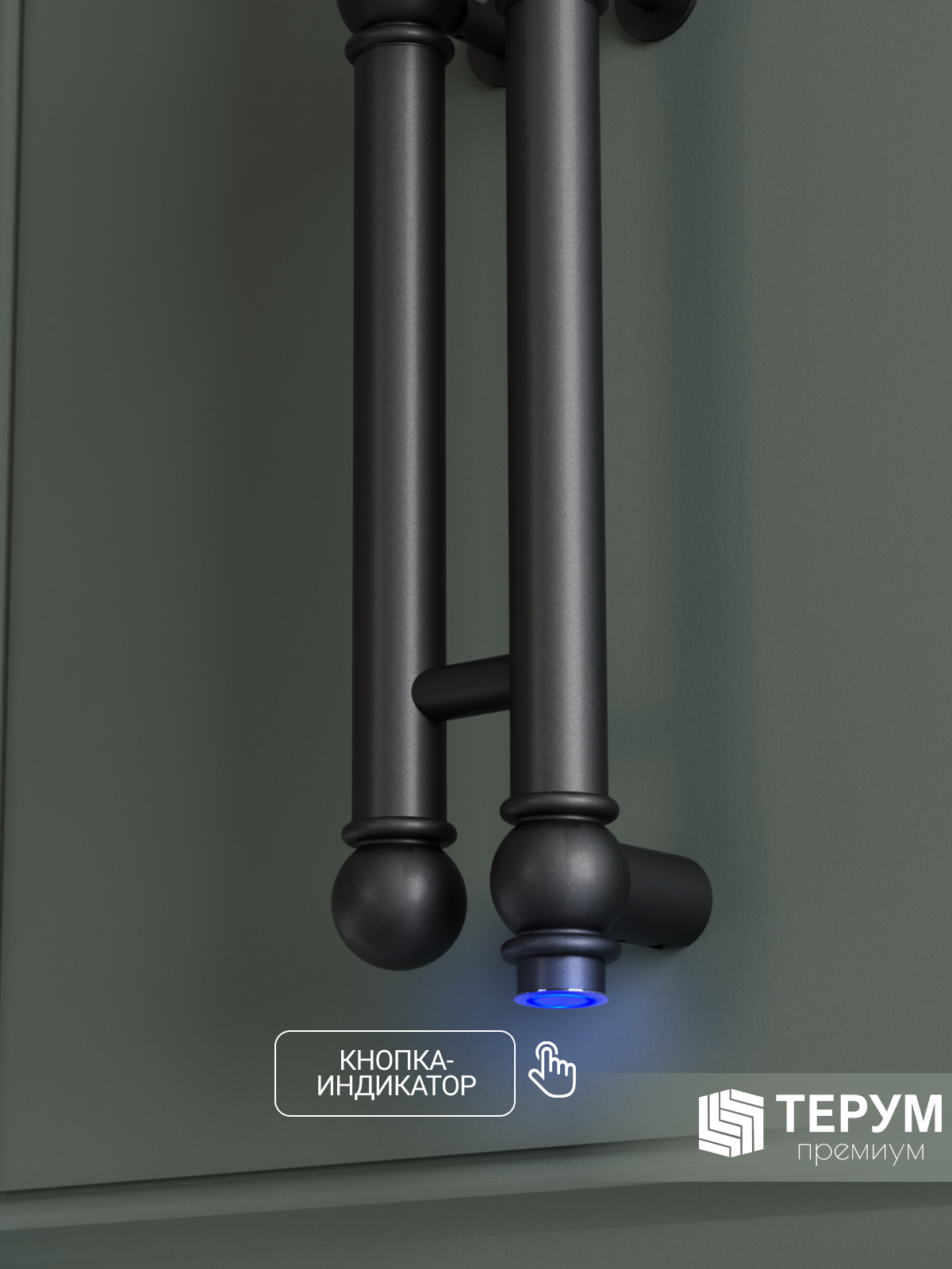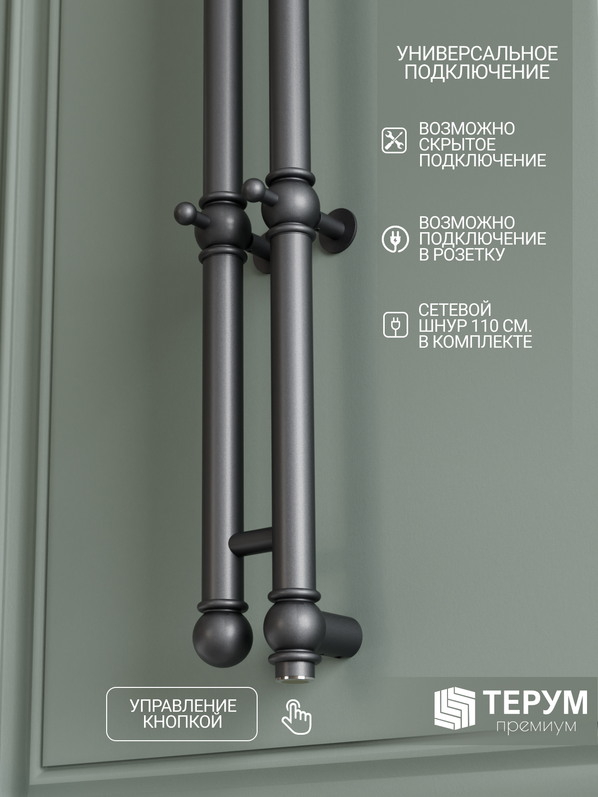 Конструкция: Вертикальная модель из круглого профиля с фактурой и крючками на изделии. Кнопка включения/выключения с подсветкой.
