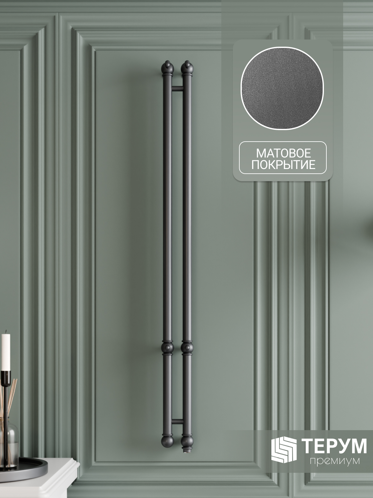 Электрический полотенцесушитель Vintage 2 с матовым покрытием "Графит". Компактная вертикальная модель с матовым покрытием. Распределенные по изделию крючки позволяют комфортно разместить текстиль и обеспечить всегда теплые полотенца под рукой. Покрытие устойчиво к царапинам, на нем не остаются отпечатки во время эксплуатации. Узкий полотенцесушитель не занимает много места и подойдет даже для небольшой ванной комнаты. Помогает создать комфортный микроклимат в ванной и предотвратить появление плесени.