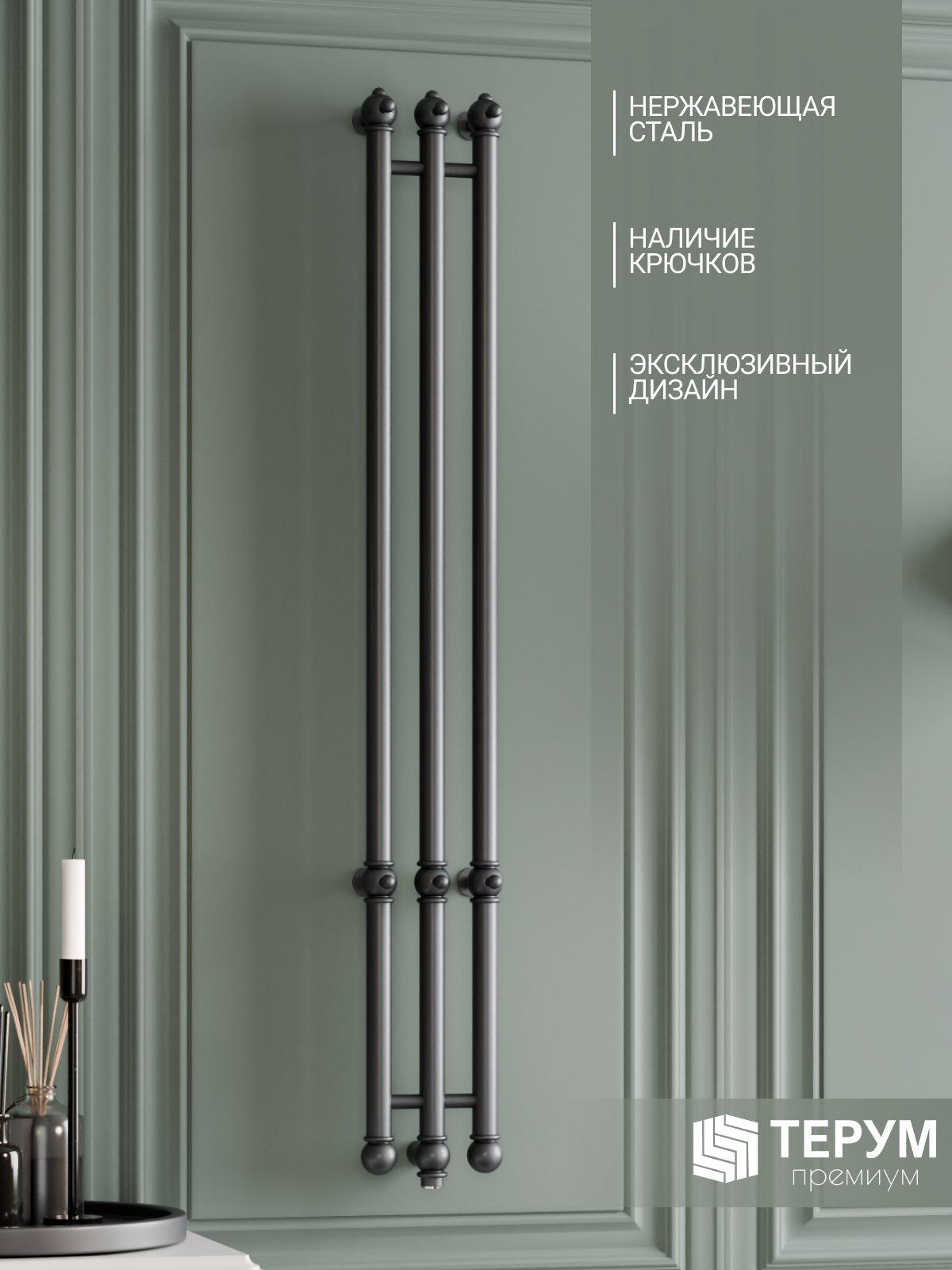 Конструкция: Вертикальная модель из круглого профиля с фактурой и крючками на изделии. Кнопка включения/выключения с подсветкой.