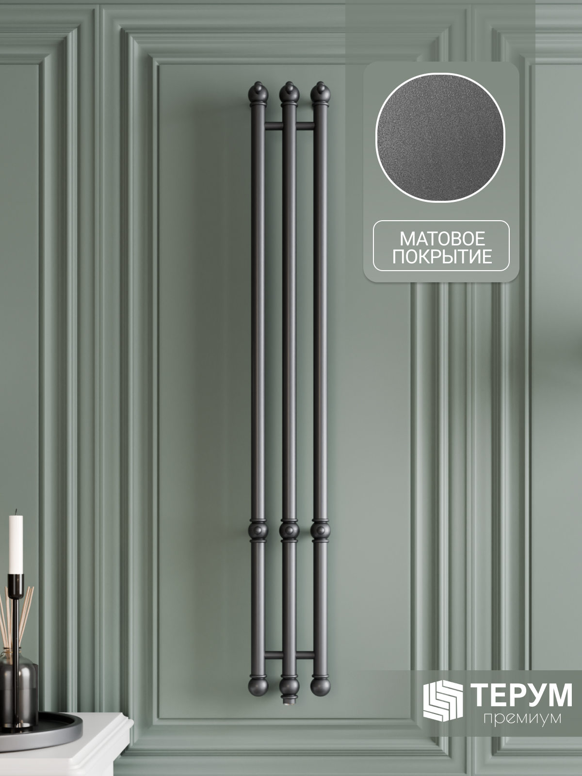 Электрический полотенцесушитель Vintage 3 с матовым покрытием графит. Компактная вертикальная модель с глубоким матовым цветом. Распределенные по изделию крючки позволяют комфортно разместить текстиль и обеспечить всегда теплые полотенца под рукой. Покрытие устойчиво к царапинам, на нем не остаются отпечатки во время эксплуатации. Узкий полотенцесушитель не занимает много места и подойдет даже для небольшой ванной комнаты. Помогает создать комфортный микроклимат в ванной и предотвратить появление плесени.