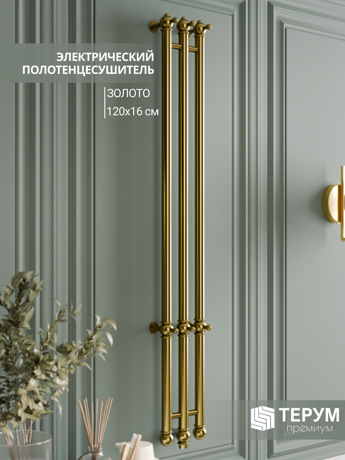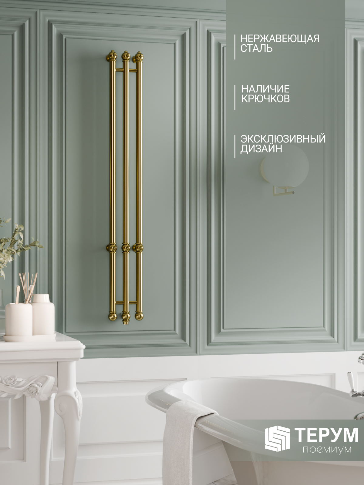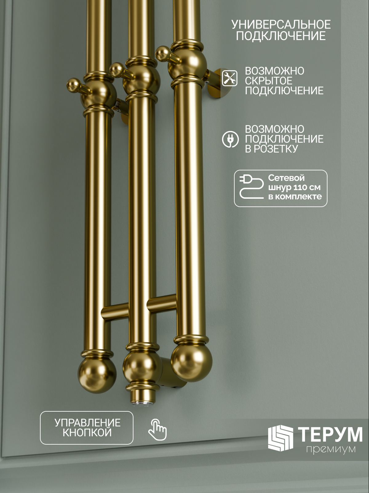 Электрический полотенцесушитель Винтаж 3 с глянцевым покрытием "Золото лак". Компактная вертикальная модель с глянцевым покрытием. Распределенные по изделию крючки позволяют комфортно разместить текстиль и обеспечить всегда теплые полотенца под рукой. Покрытие устойчиво к царапинам, на нем не остаются отпечатки во время эксплуатации. Узкий полотенцесушитель не занимает много места и подойдет даже для небольшой ванной комнаты. Помогает создать комфортный микроклимат в ванной и предотвратить появление плесени.